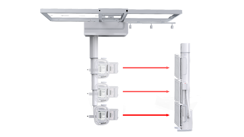 懸吊配備手動模式與電動模式,沿天軌橫縱移動時可選手動或電動,滿足不同醫(yī)護人員使用習慣。